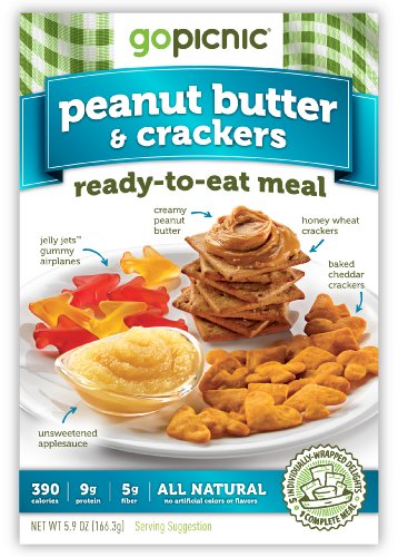 A delicious, nutritionally balanced ready-to-eat meal in a handy picnic box. Just grab a drink, spread out your GoPicnic, and let your taste buds come out and play. No refrigeration, preparation, or wicker basket required! Your Peanut Butter & Crackers GoPicnic meal features Peanut Butter & Co Smooth Operator Peanut Butter (0.7 oz), Partners Get Movin’ Honey Wheat Crackers (0.75 oz), Sweet Perry Orchards Unsweetened Applesauce (3 oz), Little Bread Hen Game On! Cheddar Crackers (0.75 oz), and Professor Zim Zam’s Extraordinary Sweets Jelly Jets (0.7 oz). 390 calories, 9g protein, 5g fiber. The foods in GoPicnic all-natural meals contain no trans fats, no added MSG, and no artificial colors, flavors or preservatives. Each meal contains five individually-wrapped food items and utensils as required. Your day is full. And you’re on empty. Time to GoPicnic!